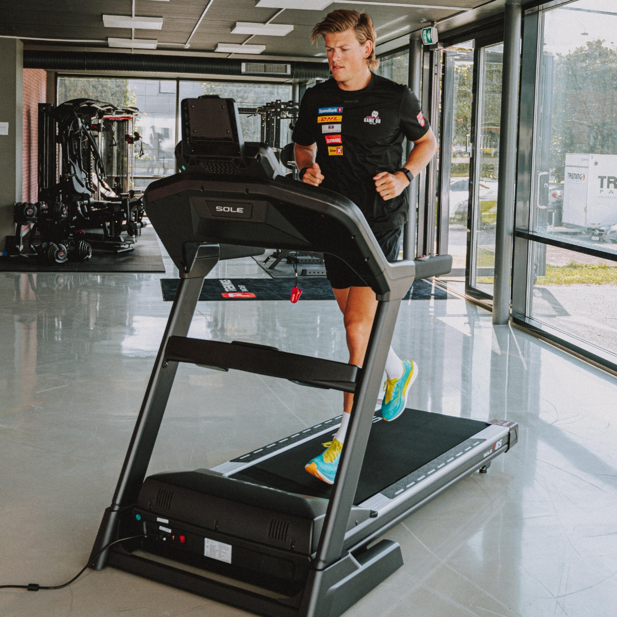 Sole F85 Tredemølle brukes blant annet av langrennsløper Johannes Høsflot Klæbo. Kraftig motor som gir toppfart på 22 km/t og maksimalt 15 nivåer motbakke. Den er meget stabil å løpe på og med et stort løpebånd på hele 56 cm bredde og 152 cm lengde, kan du løpe uten å være redd for å trå på kanten av løpebåndet. Selvsagt er den Zwift kompatibel.