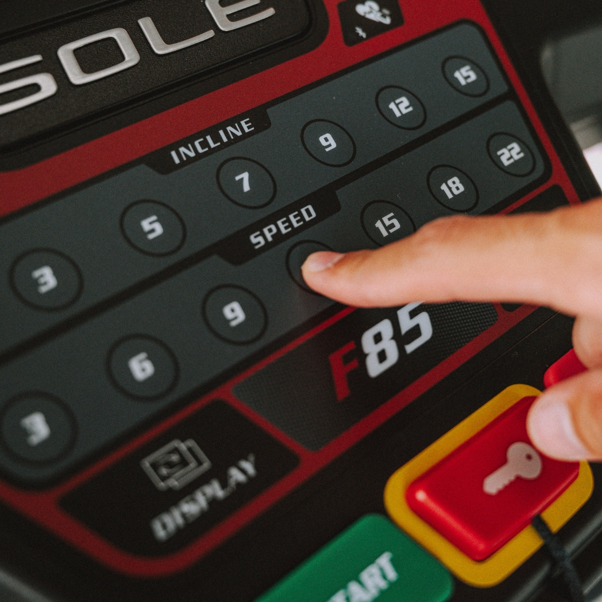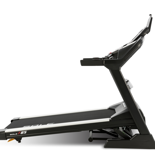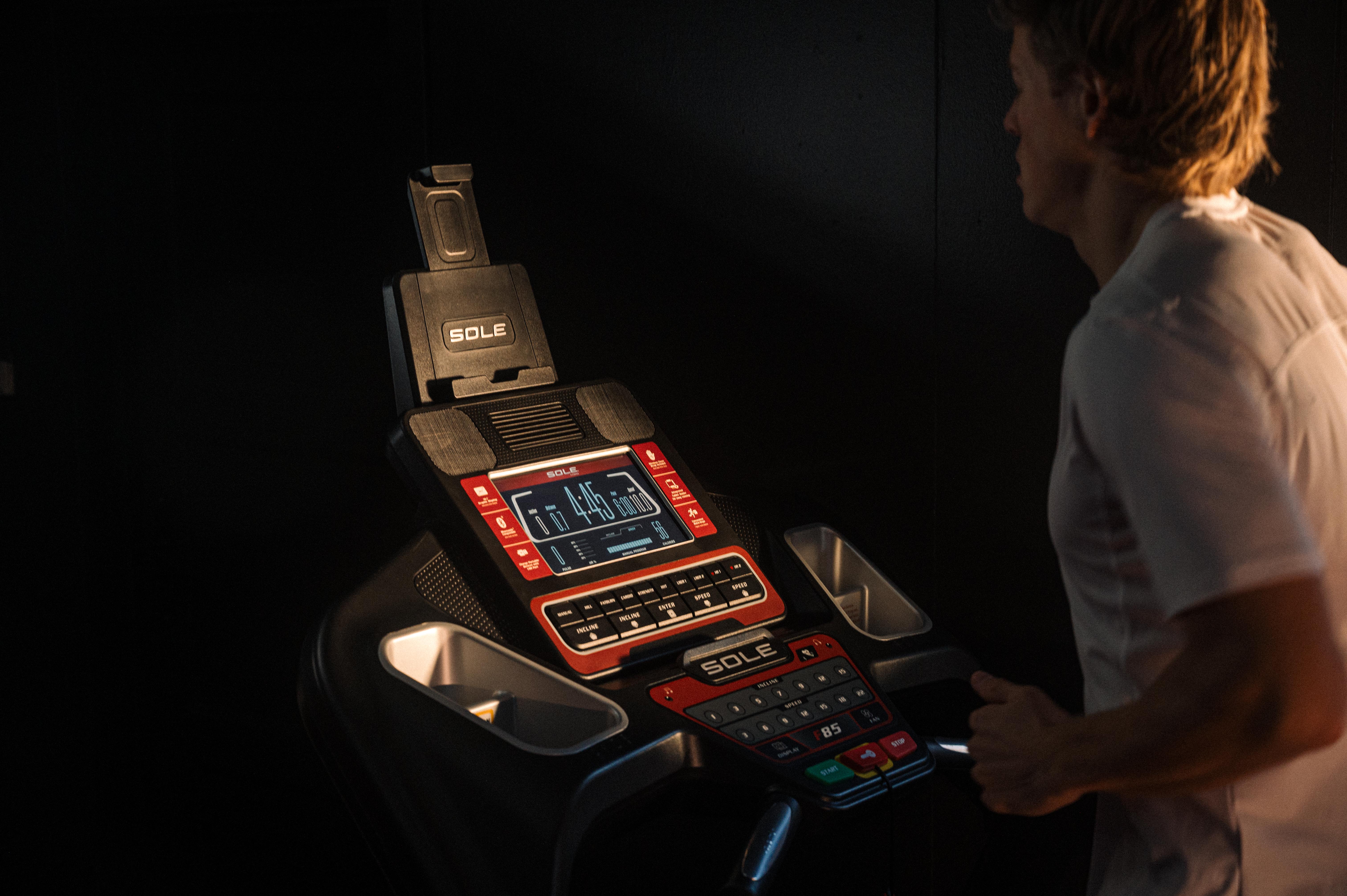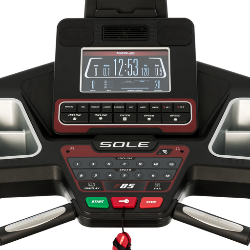Sole F85 har et meget oversiktlig konsoll for justering av stigning og hastighet. Egen holder for ipad/tablet, om du vil se film, TV eller oppdatere sosiale medier. Kraftig motor med hastighet til 22 km/t. Gjør dette til en kraftig og meget god tredemølle for hjemmetrening. Displayet er brukervennlig og gir deg all den informasjon du trenger for følge med på hastighet, stigningsprosent, tid, distanse, minutter pr km, kaloriforbruk og puls. Hurtigknapper for innstilling av hastighet med intervallene 3, 6, 9, 12, 15, 18 og 22 km/t. Høyden som løpeflaten bygger fra gulvet ligger mellom 18cm - 31 cm avhengig hvilken stigning fra 0 nivå til 15 nivå som brukes.