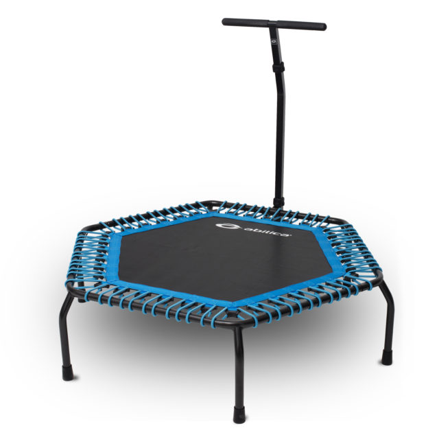 Trening på Abilica BounceUp er også skånsom forleddene. Trampoline med 36 stk. separate strikker, som gir meget god sprett og lang holdbarhet. En og en strikk kan byttes ut ved behov. 6 stk. vinklede ben med gummifot gir ekstra god stabilitet. Justerbart håndtak som også kan tas helt av. Rammen monteres raskt og enkelt, uten verktøy, ved hjelp av «klikk låser».