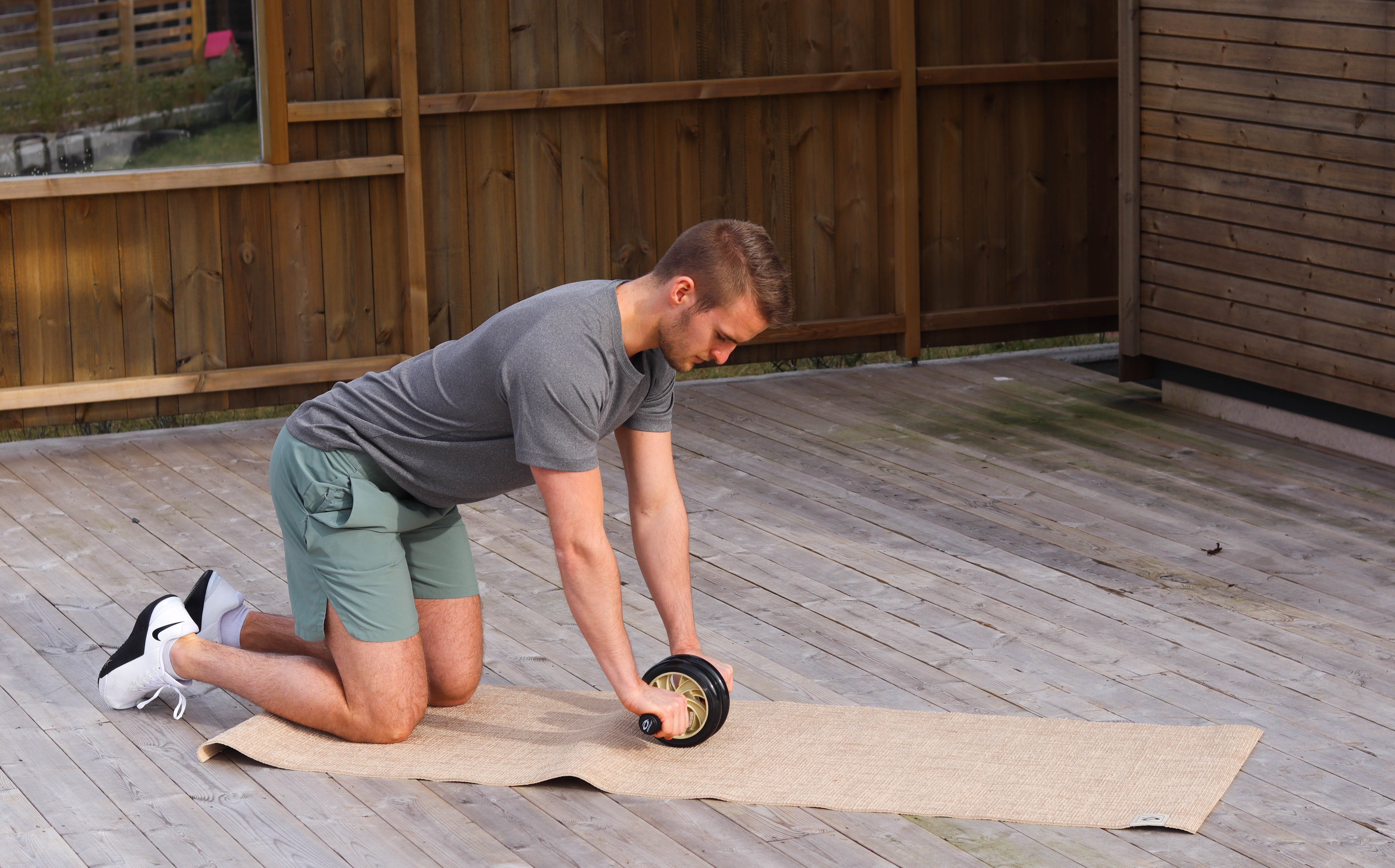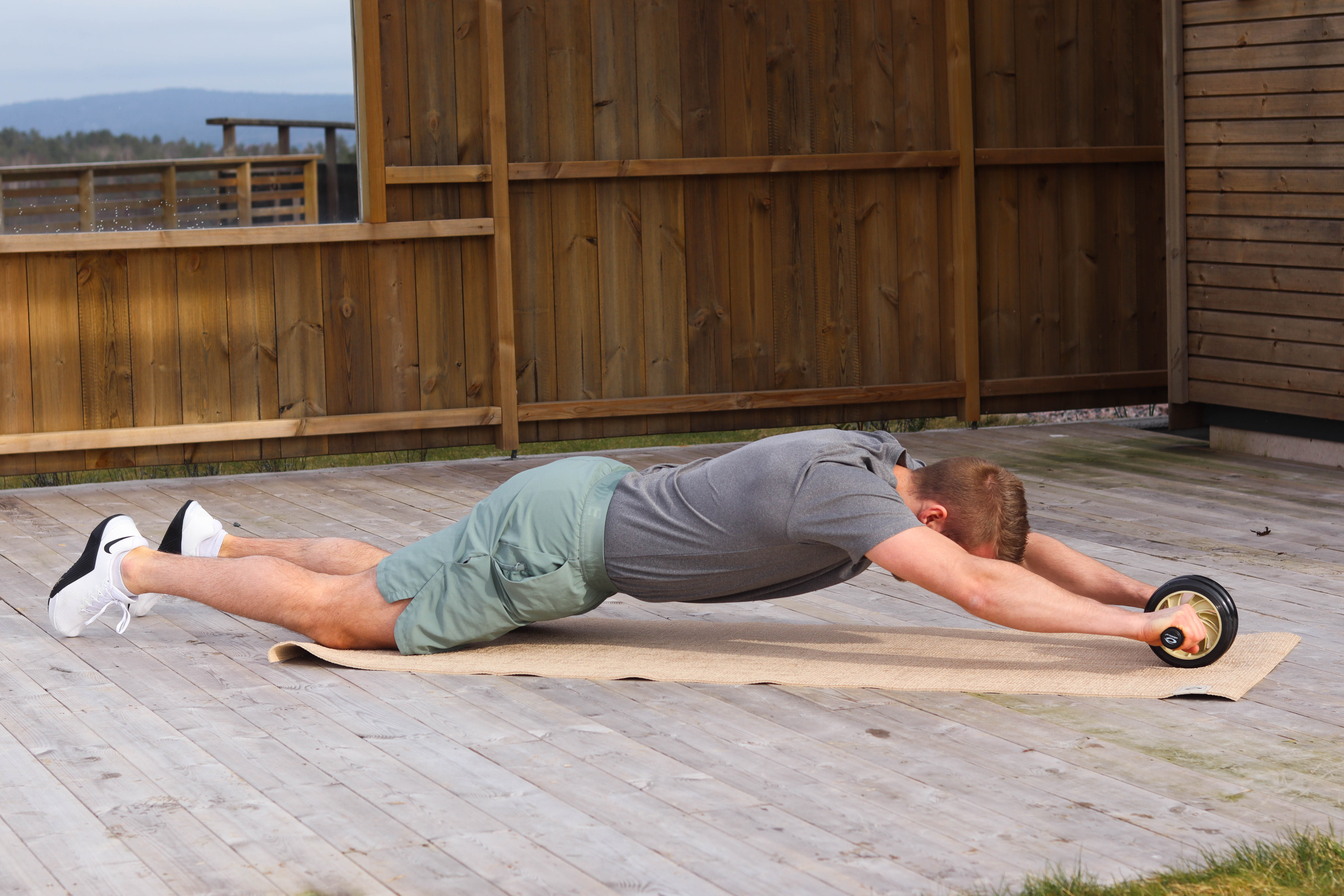 Jo lengre ut du ruller hvor tyngre blir det. For ekstra magetrening kan du løfte knærne opp fra gulvet og ha kun tæ