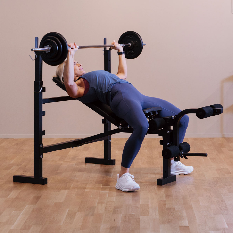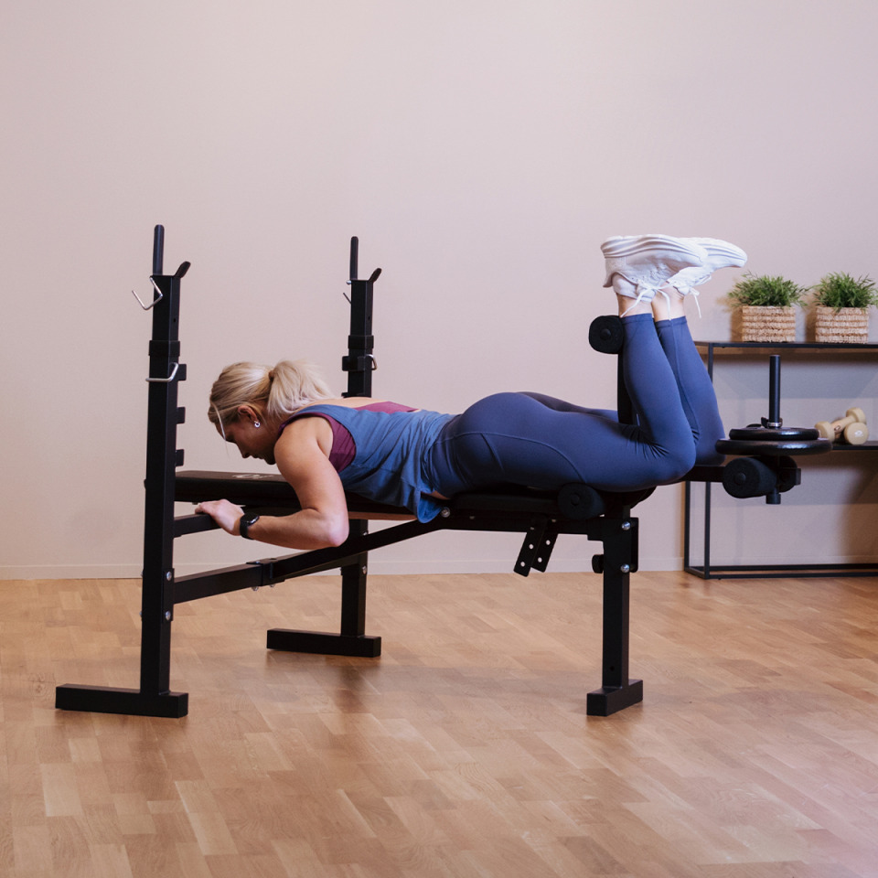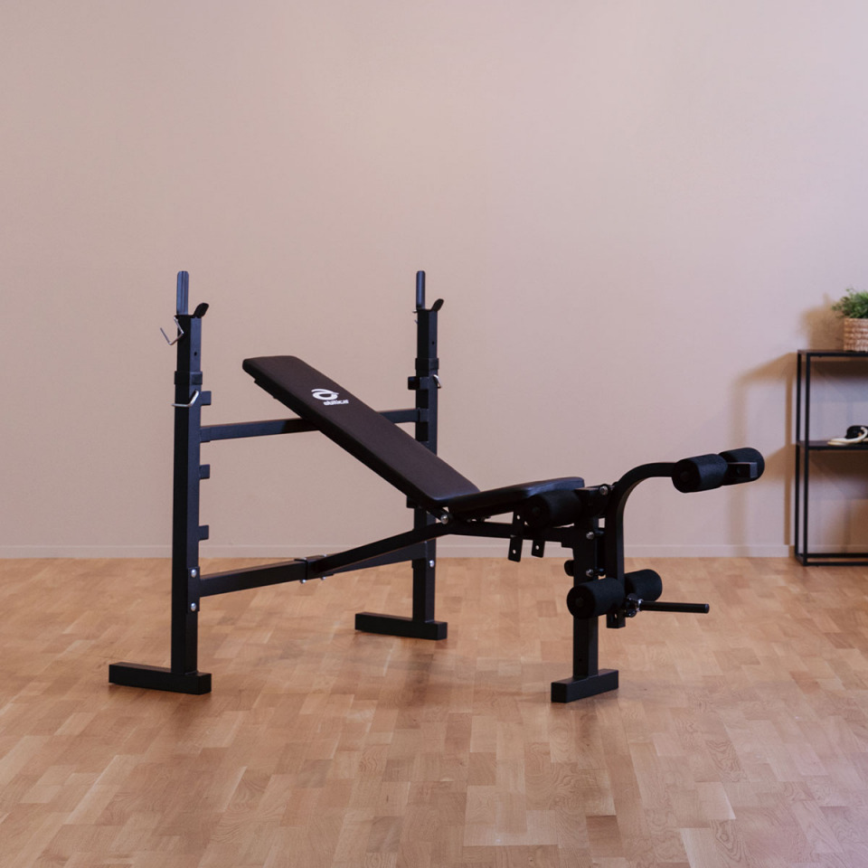 Benken har god polstring på sete og rygg som gjør det behagelig å trene. Ryggen kan justeres i 5 vinkler, inkludert legges flat og negativ. Vektstolpene kan justeres i høyden etter behov. Total bredde 110 cm gjør at du kan bruke både 220 cm stang og 180 cm stang.