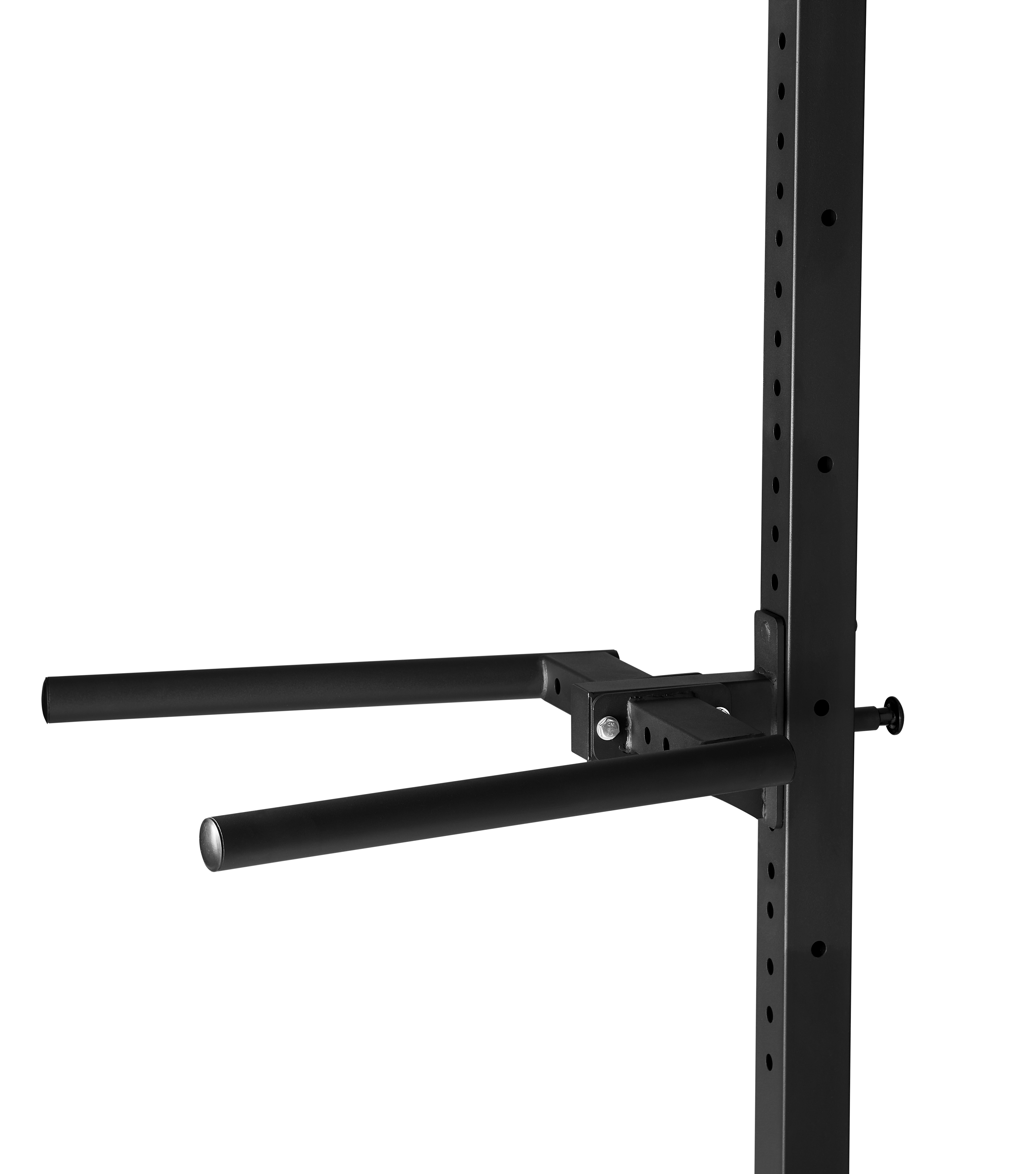 Det er i tillegg låsepinne på baksiden av håndtaket slik at det sitter godt fast i racket når du gjør øvelser. Dips armene har en diameter på 50 mm slik at du har et godt, stabilt og komfortabelt grep. Passer til alle rack med 75x75mm rammestørrelse med 17 mm diameter hull.