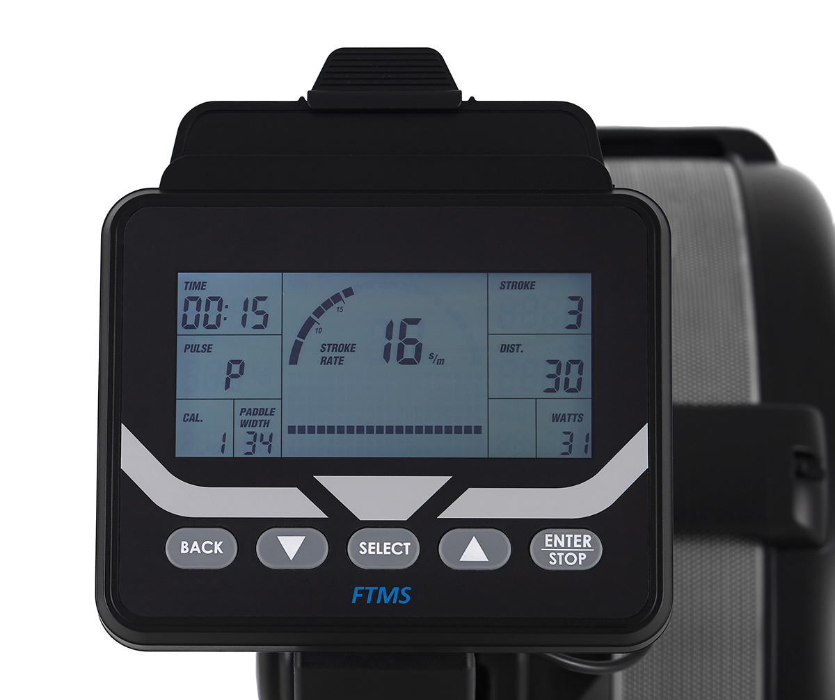 - Brukervennlig treningscomputer: Viser sanntidsdata for tid, distanse, kalorier, watt og rotak per minutt