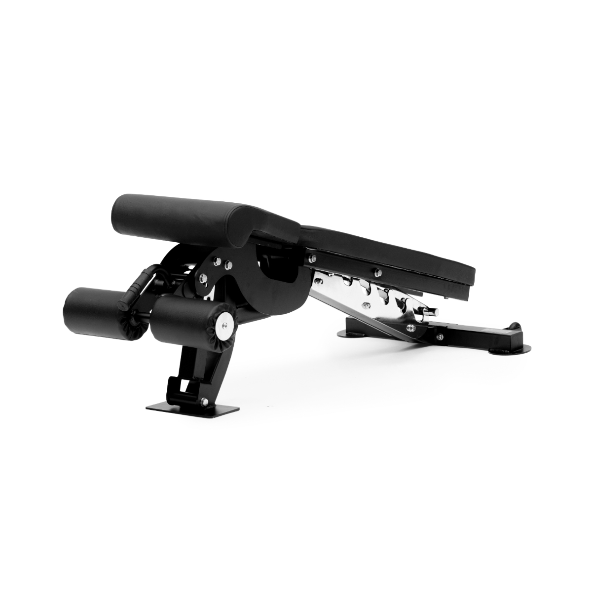 Denne benken har 7 justerbare nivåer på ryggen, som kan stilles fra -15° til 85°. Den ekstra lange og brede ryggputen gjør benken godt egnet for brukere i alle størrelser. Med en tykk ryggpute sikres både komfort og stabilitet under treningen. Benken er også utstyrt med leggputer som kan låse bena, noe som er praktisk for øvelser som situps. For å beskytte gulvet har benken gummibeskyttelse under føttene.