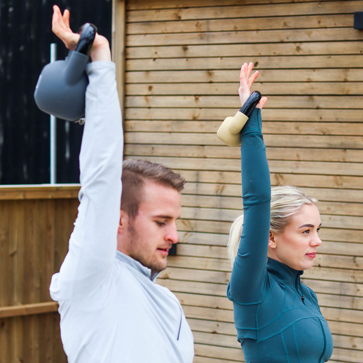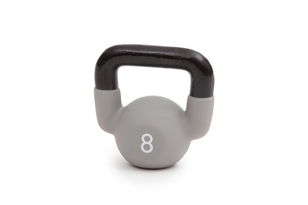 KettleBells i støpejern med sort lakk, delvis trukket med farget neopren belegg.