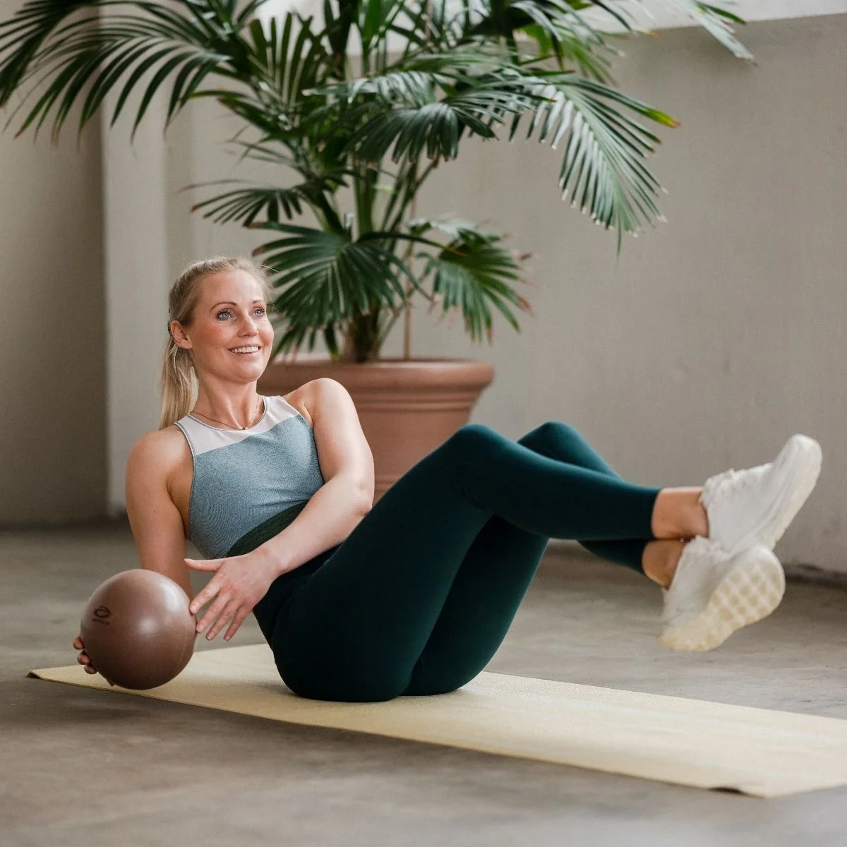 Ballen er en allsidig og effektiv rekvisitt som du kan blåse opp og tømme for luft for å ta med deg på farten! Du kan trene en rekke muskler som kjernen, indre lår og bekken. Ingenting styrker kjernen eller toner de indre lårene mer enn denne ballen.