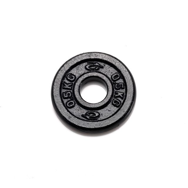 Støpt 0.5 kg vektskive med sort lakk og 25 mm senteråpning.