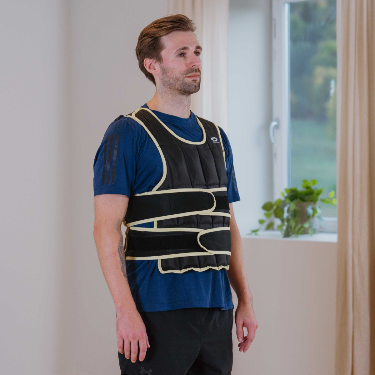 Denne justerbare vektvesten på opptil 20 kg er designet for deg som vil utfordre styrke, utholdenhet og eksplosivitet. Vektvesten har 38 vektposer i nylon fylt med jernsand for jevn og stabil vektfordeling. Det er 22 poser bak og 16 foran, hver på 0,5 kg. Til sammen gir det 19 kg i vekter, pluss 1 kg for selve vesten – totalt 20 kg. Du kan enkelt justere vekten ved å ta ut og inn poser etter behov.
