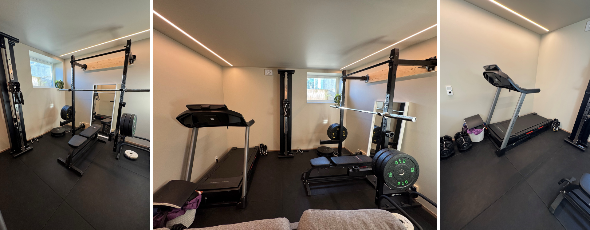 Jeg hadde lav takhøyde i kjelleren og måtte pigge gulvet for å få plass i høyden (jeg er 187cm). Dette var mye arbeid og kostbart, men sluttresultatet ga et perfekt trimrom kombinert med kjellerstue. Jeg har også satt inn ekstra ventilasjon for å ikke koke bort under intervallene.