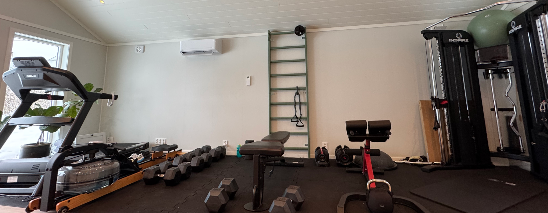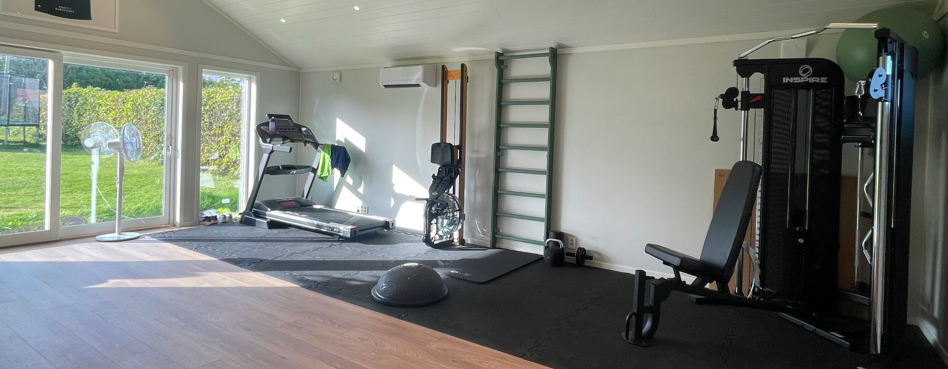 Løsningen? Et fullverdig treningsrom – eller rettere sagt, et treningshus – på ca. 45 kvadratmeter, bygget på en del av hagen som tidligere ikke ble brukt. Her ble det satt opp alt av utstyr som trengs for både styrke- og kondisjonstrening, og hele investeringen ble gjort hos Treningspartner.