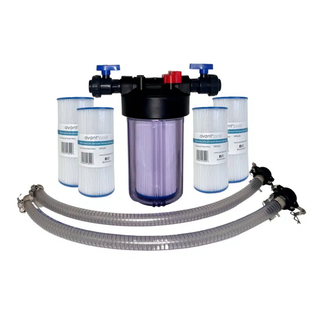 Filterpakke beskytter kjøle-/varmeenheten mot smusspartikler og holder dem borte fra vannsirkulasjonen. Filterhuset leveres med forhåndsmonterte slanger og hurtigkoblinger og to kuleventiler. Filtreringspakken inkluderer også ett filter inne i huset og 4 ekstra filtre. Filtrene må rengjøres ukentlig. Skittent filter vil senke vannstrømmen. Rengjøring av filteret regelmessig gjør også at det varer lenger. Vi anbefaler å bytte filter hver 1-3 måned avhengig av bruken av bassenget.