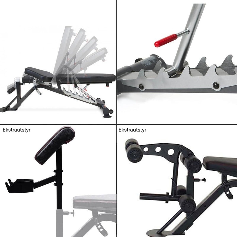 For ekstra stabilitet er benken utstyrt med en benholder. Den er også kompatibel med Leg Extension-tilbehøret, som utvider mulighetene for effektiv beintrening. Denne benken passer perfekt i ethvert treningsoppsett og gir den støtten og justeringene du trenger for å gjennomføre varierte økter.