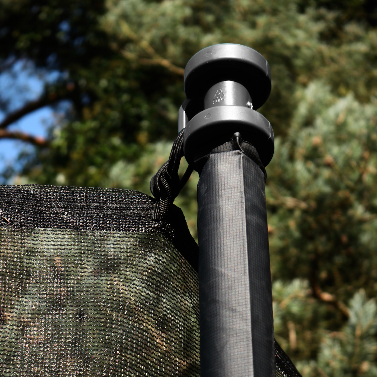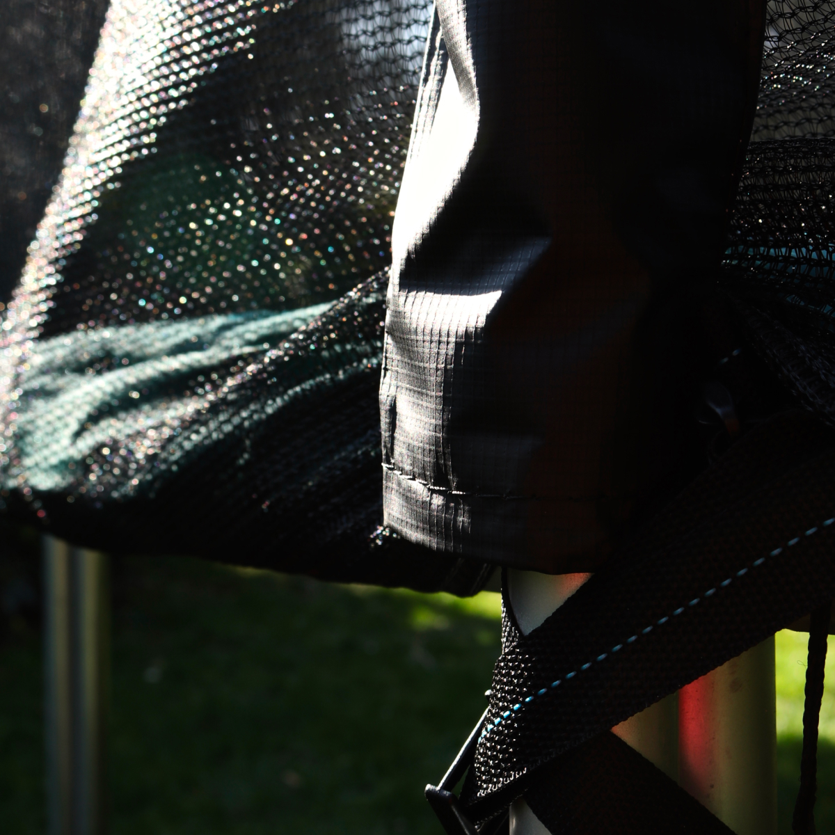 Sikkerhetsnettet har overlappende inngang som lukkes automatisk, noe som både øker sikkerheten og bidrar til lengre levetid på nettet. Nettet er finmasket for å hindre at fingre eller tær setter seg fast, og stolpene går helt ned til bakken for stabil og enkel montering. Stolpene er godt polstret og utstyrt med solide plastkopper som holder nettet stramt og sikkert på plass med elastiske strikker, noe som fordeler belastningen jevnt og forlenger levetiden på både nett og innfesting.