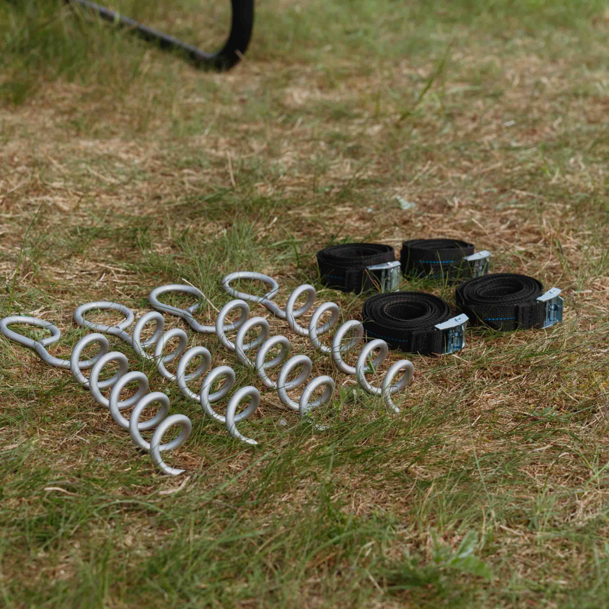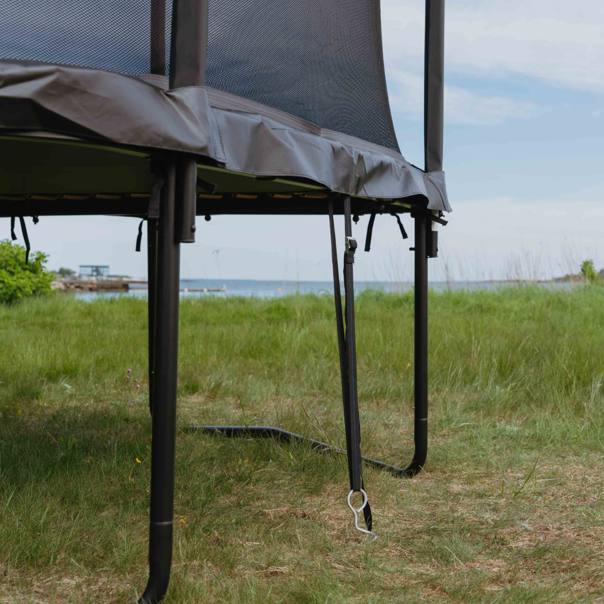 Forankringssett med mulighet til å feste trampolinen enkelt til bakken, slik at den står stabilt og ikke velter i sterk vind.