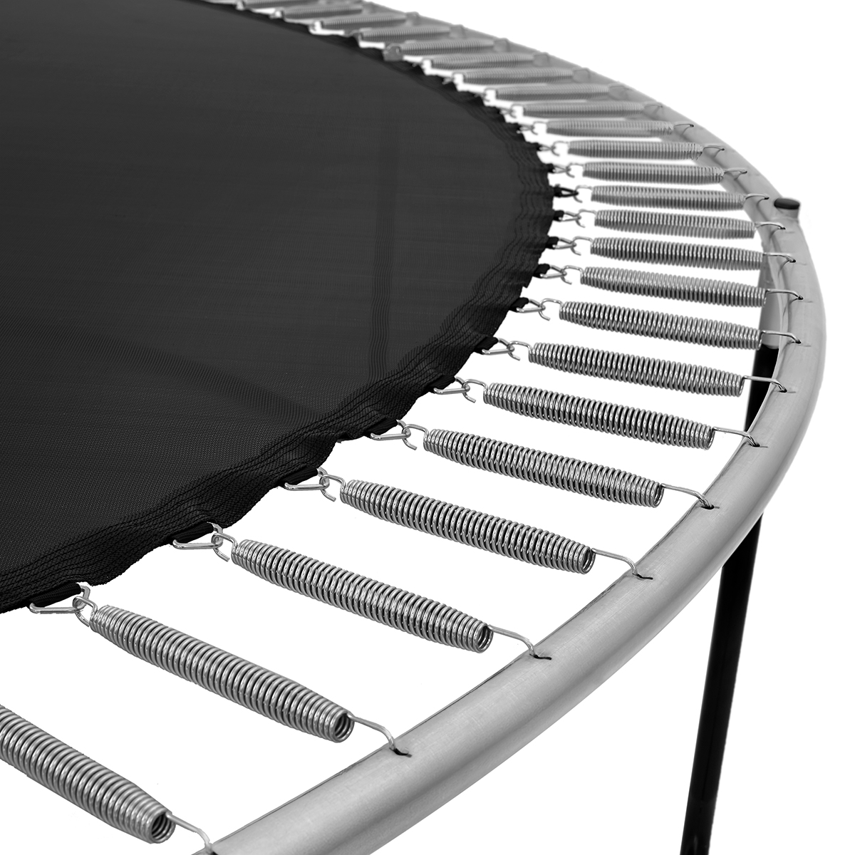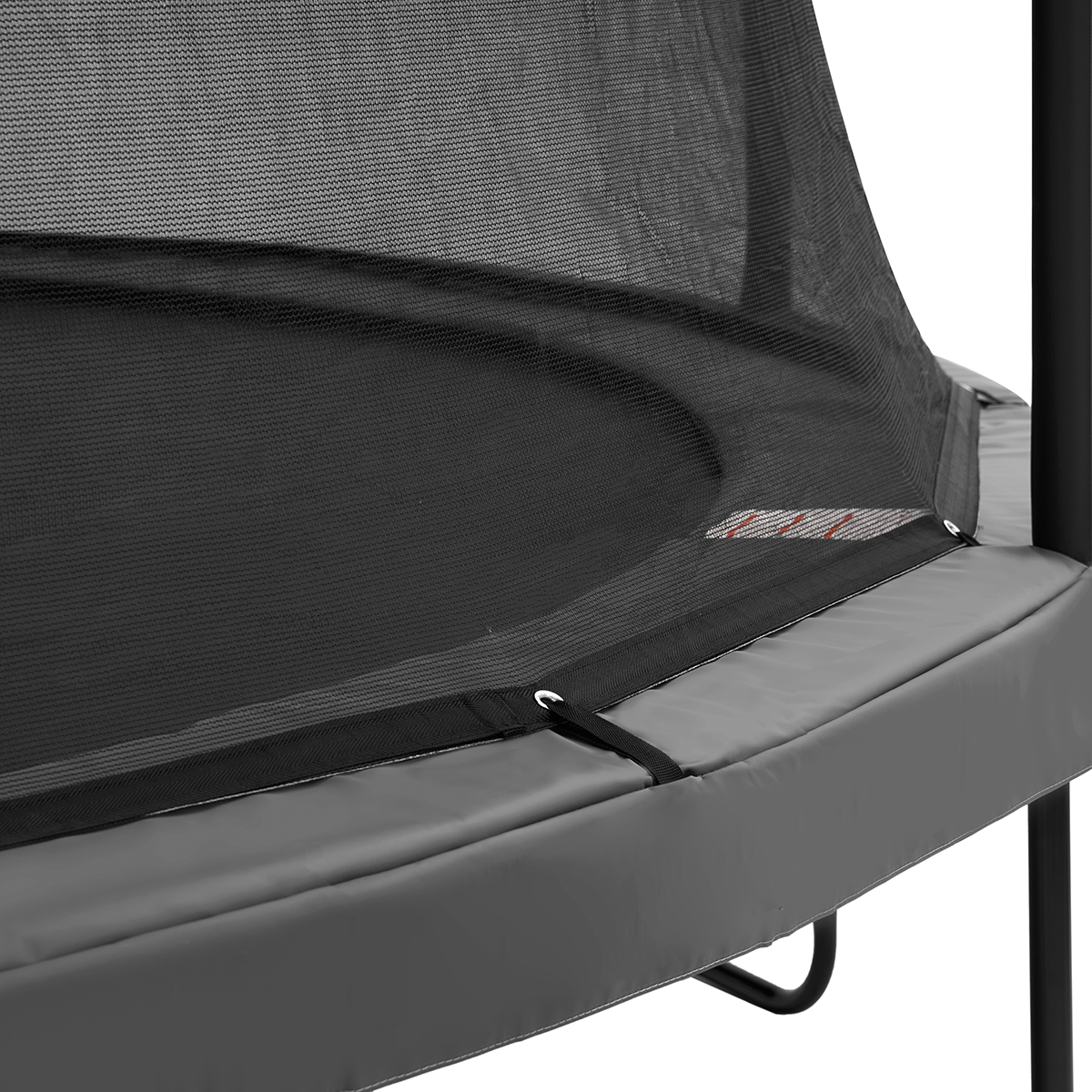Det patenterte festesystemet mellom nett og ramme gir ekstra støtte og stabilitet under hopping. En integrert glassfiberring i toppen av nettet holder nettet stramt også etter lengre tids bruk og bidrar til en jevn og stabil innramming.
