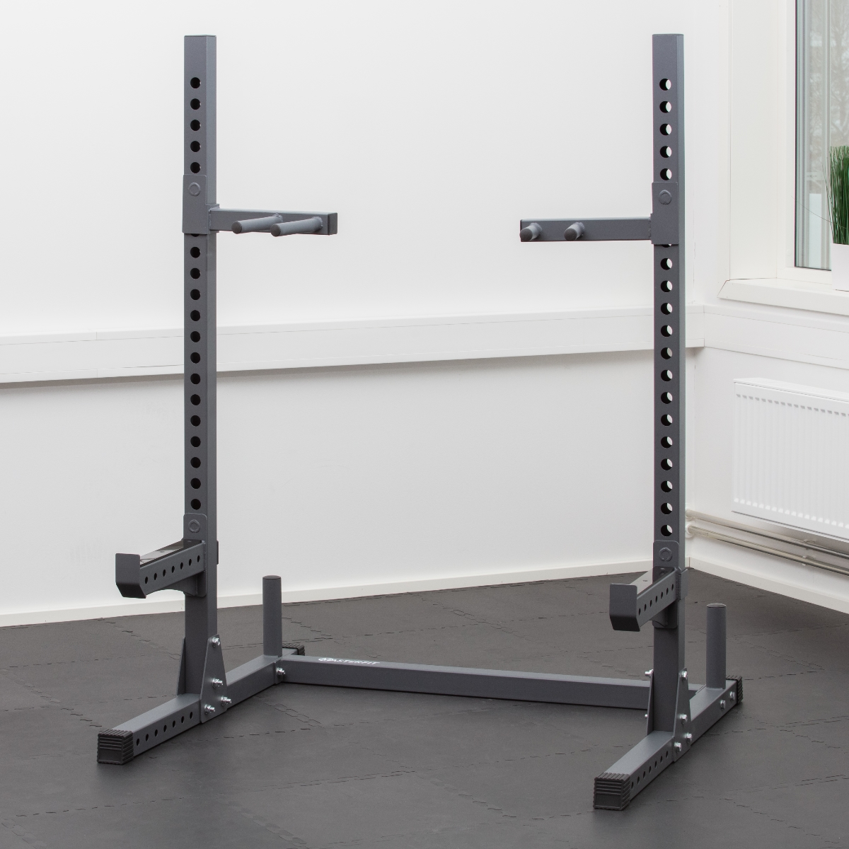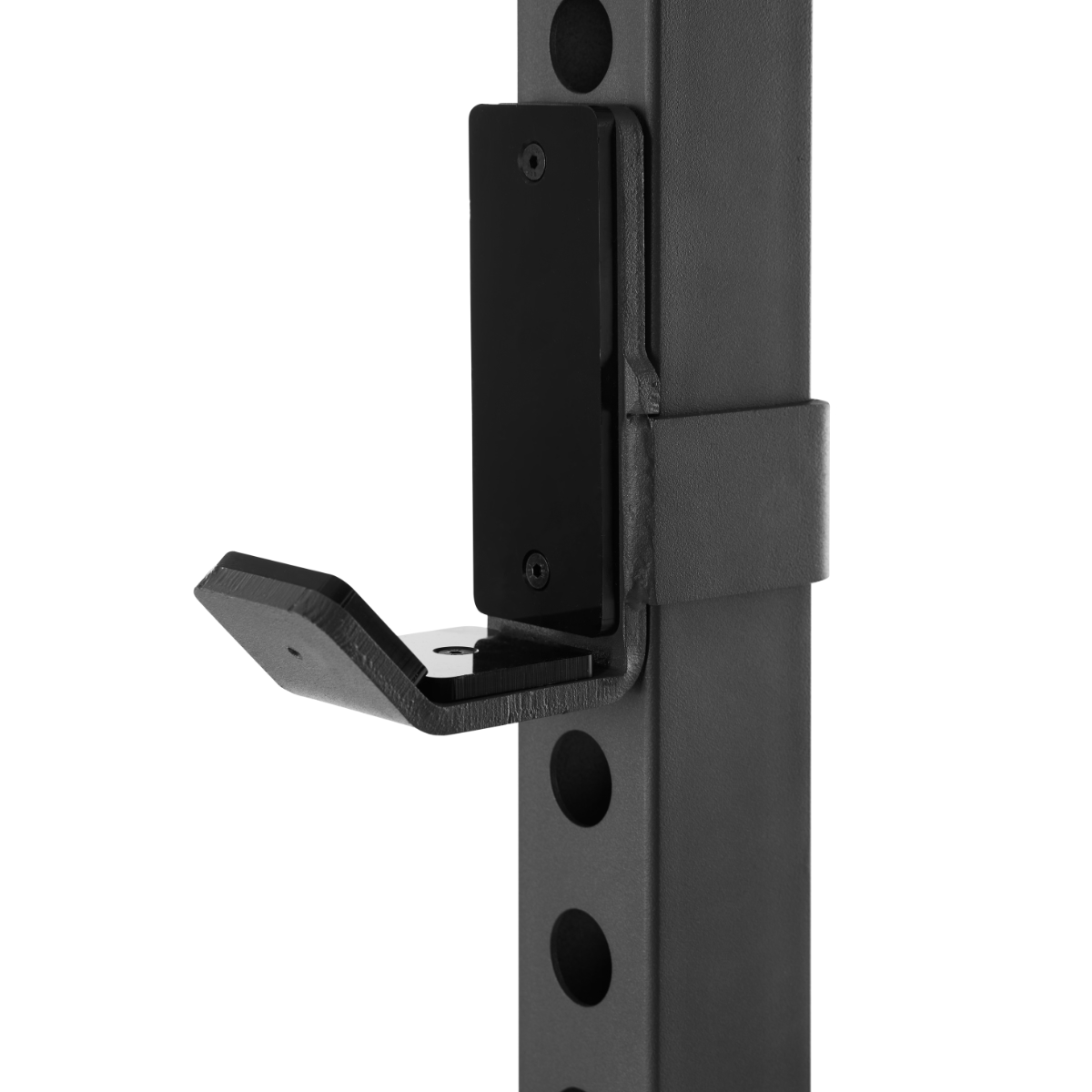 Masterfit 200 Squat Rack har en bredde på 122 cm og dybde på 112 cm som gjør dette knebøystativet svært godt egnet til øvelser inne i racket. Med 25 justeringshull med høyeste punkt på 155 cm kan jhooks og sikringsarmene enkelt tilpasses din høyde for best mulig utførelse av øvelsene. Sikringsarmene er på hele 38 cm lengde som gjør at du kan utføre øvelser som knebøy og benkpress med høy sikkerhet.