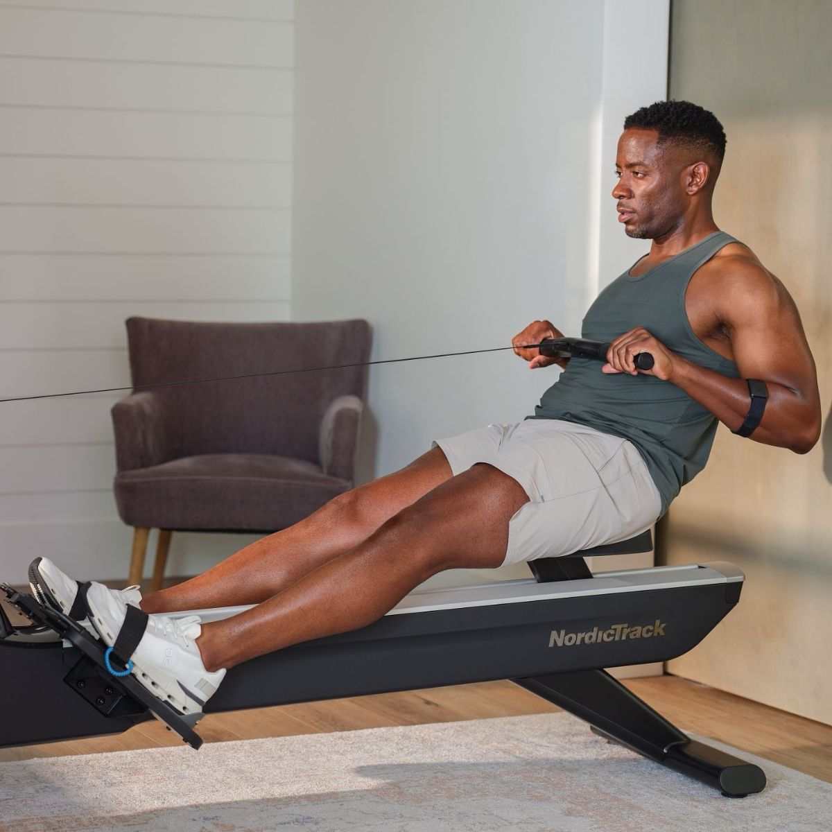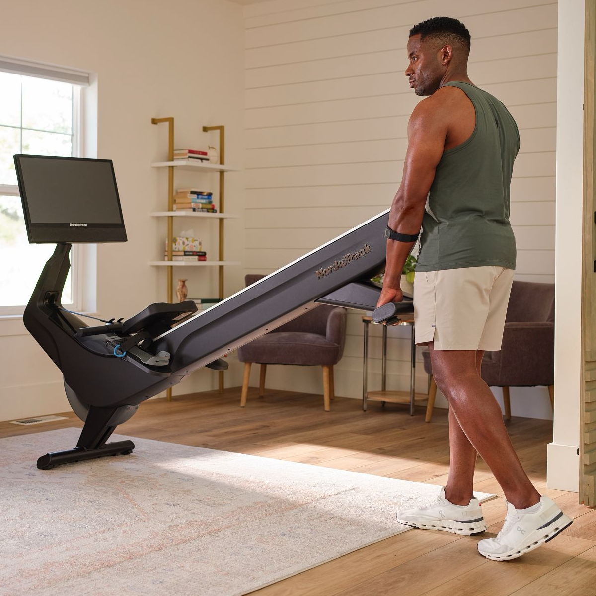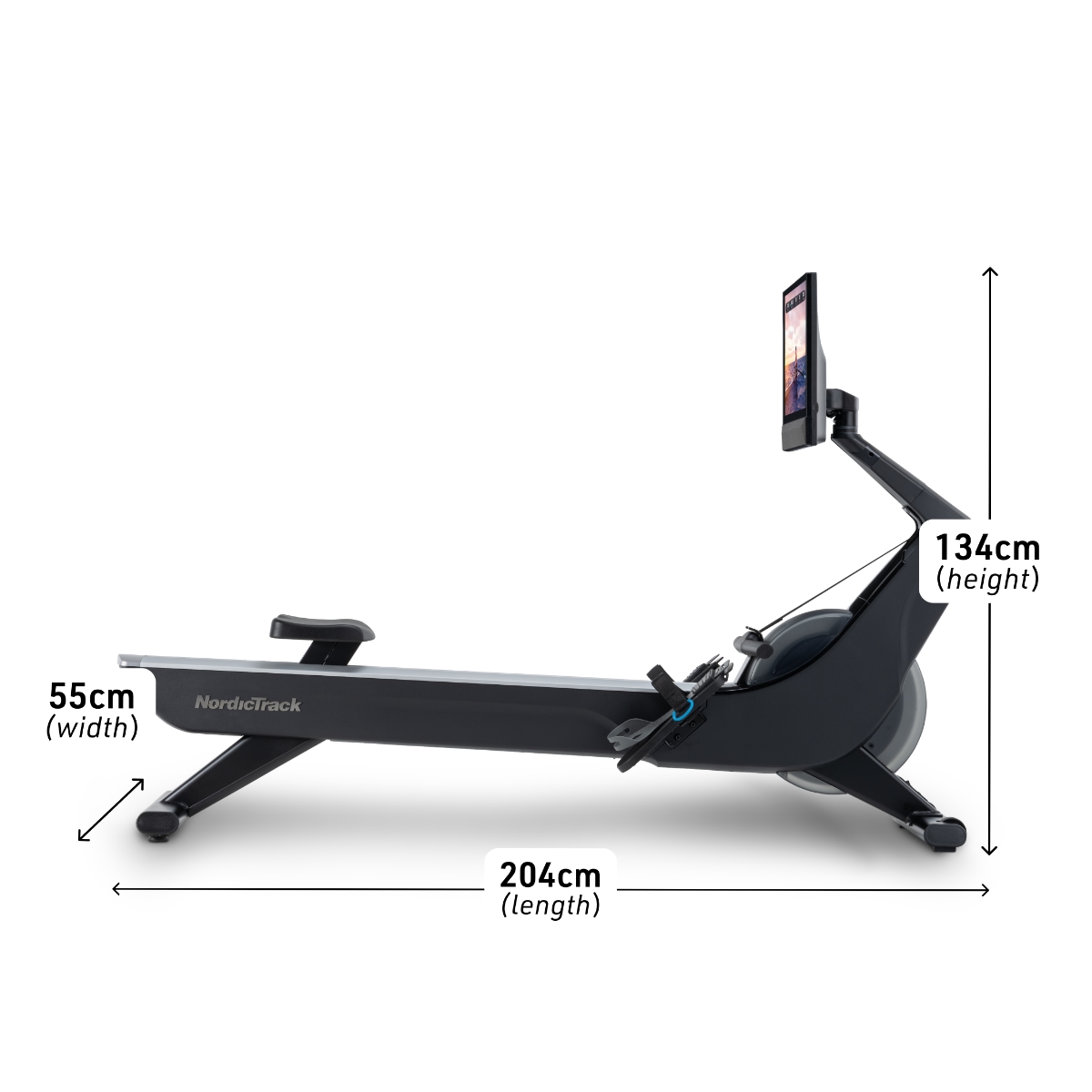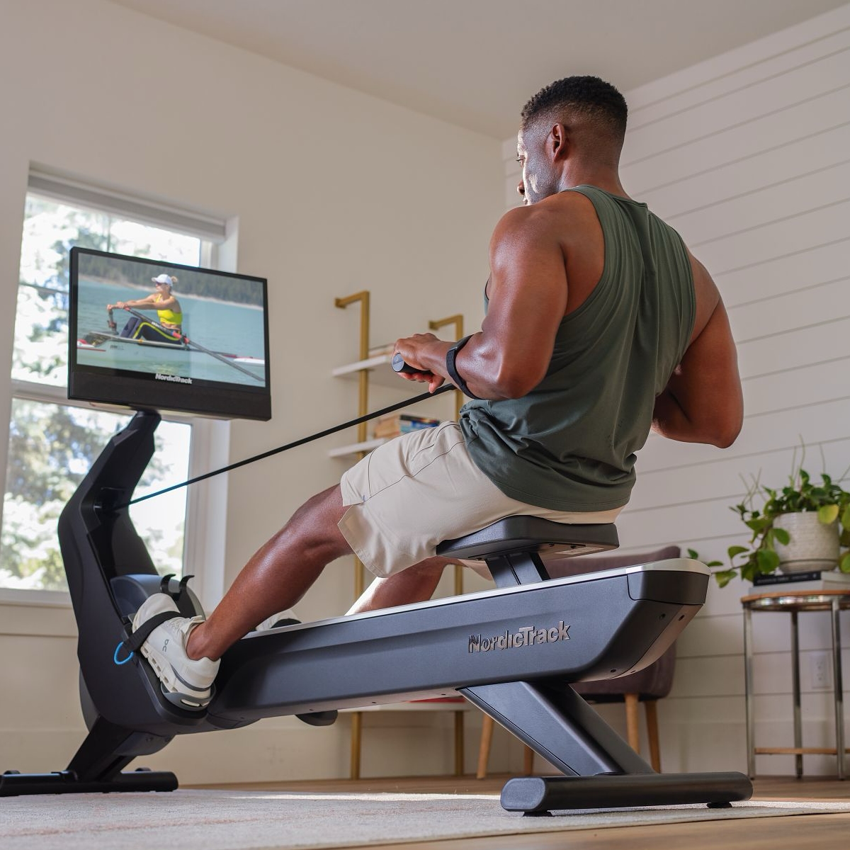NordicTrack RW900 interaktive romaskin med 26 digitale motstandsnivåer og vendbar touchskjerm på 24" tommer. Med informasjon om watt, rotak per minutt, totalt antall drag, kalorier, distanse og per 500 meter split tid tilgjengelig i hver økt.