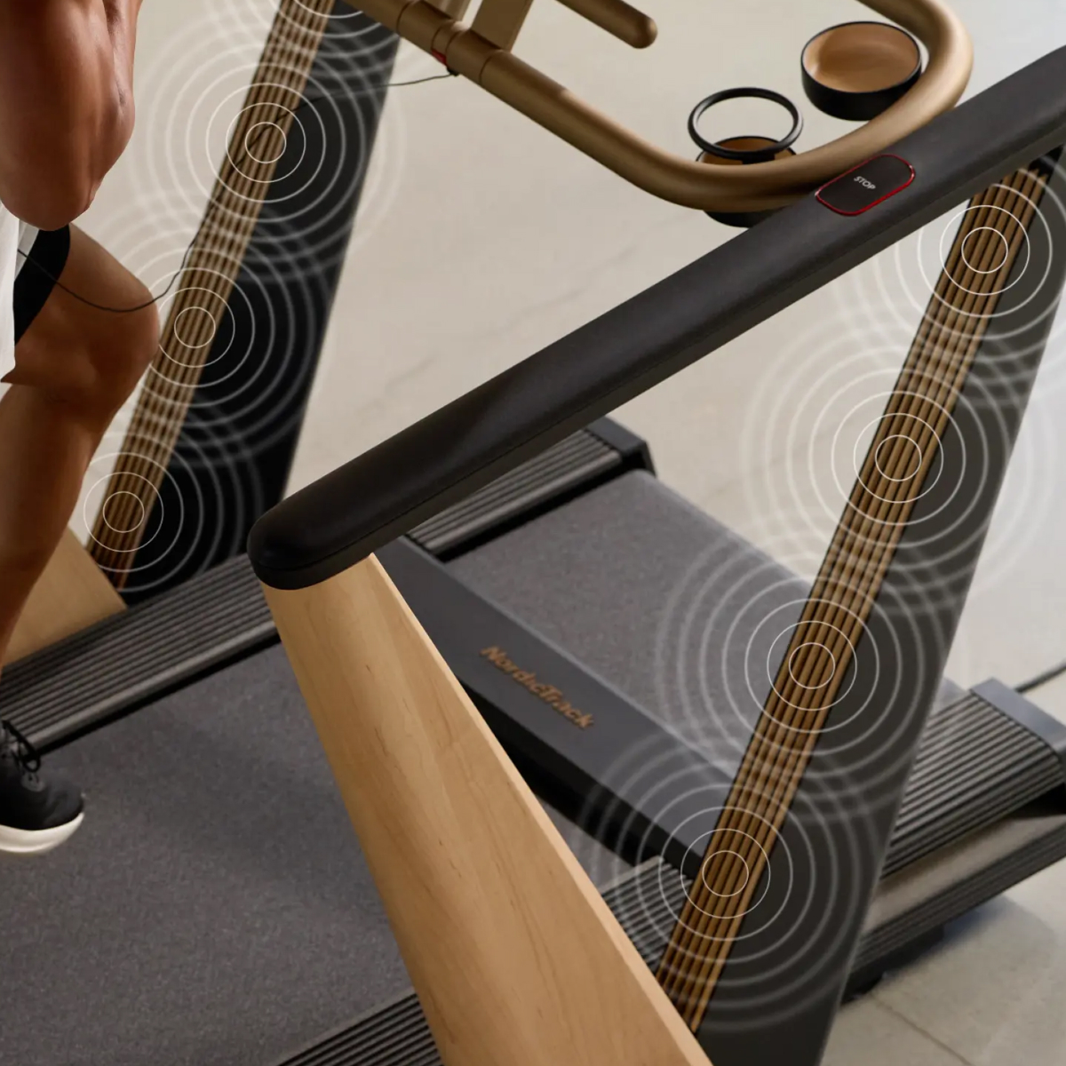 Et høykvalitets høyttalersystem med hele 8 høyttalere omgir deg med naturlyder og dynamisk musikk som forsterker treningsopplevelsen. Samtidig justerer automatiske vifter seg etter intensiteten i treningen, slik at du holder deg avkjølt og får følelsen av å løpe utendørs.