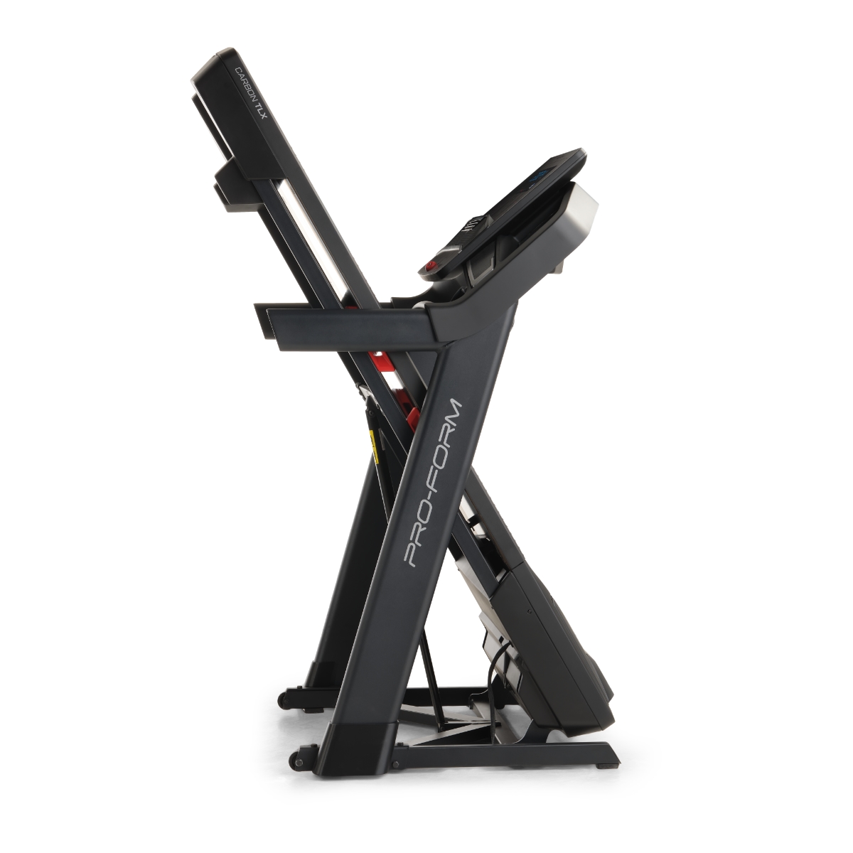 Når du ikke bruker ProForm Carbon TLX kan du enkelt felle opp løpebåndet slik at møllen tar mindre plass når den ikke er i bruk.