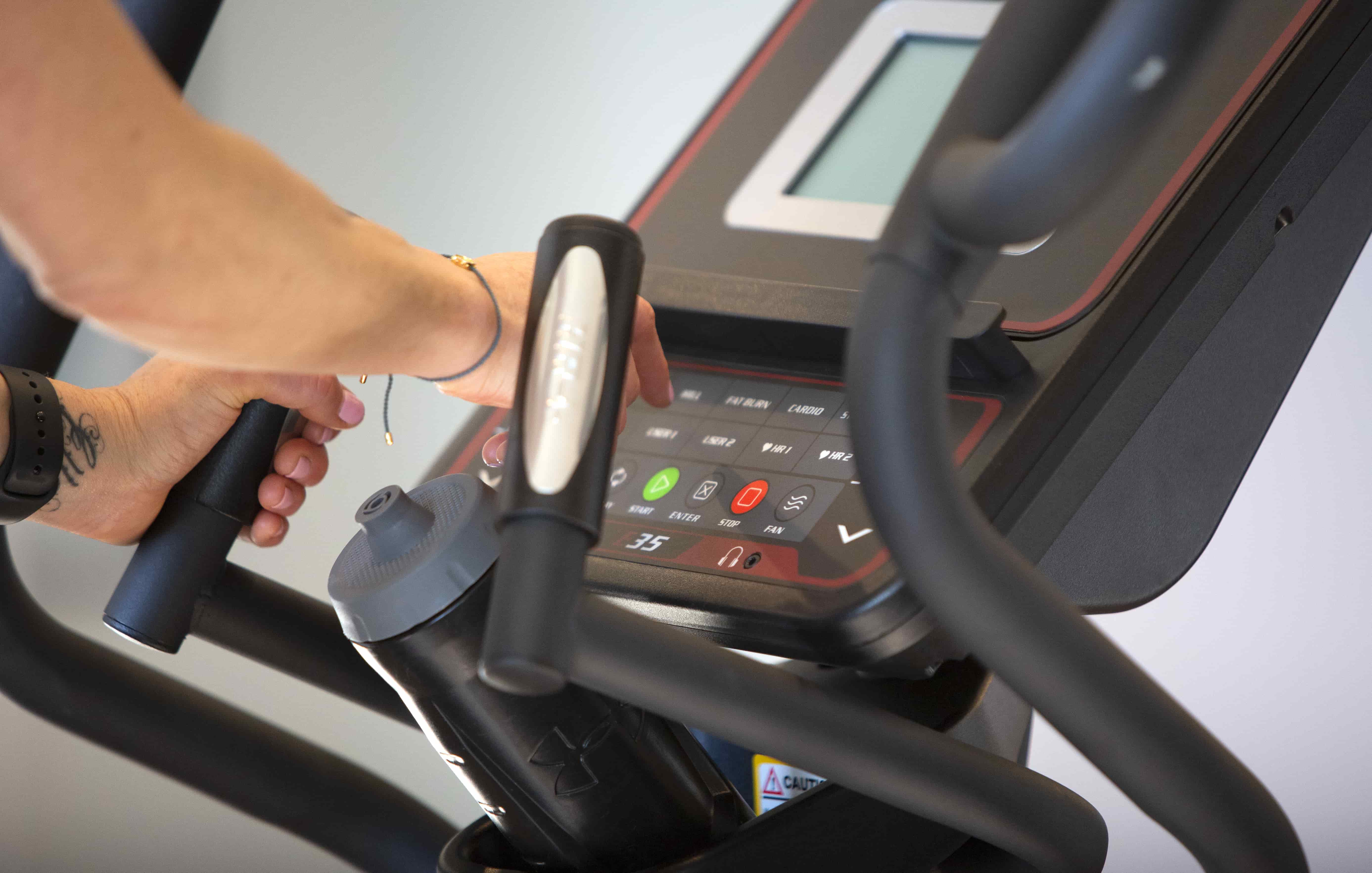 Hurtigknapper for justering av motstandsnivå og stigning på pedalrampen bak.