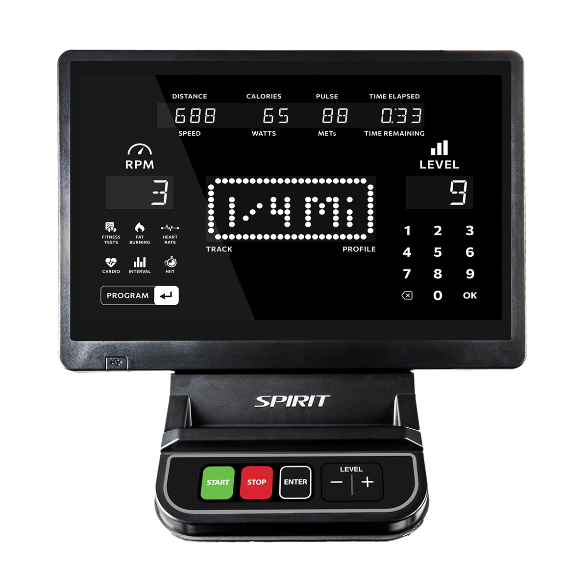 - Viste treningsdata: Tid, distanse, hastighet, watt, kalorier, puls og RPM