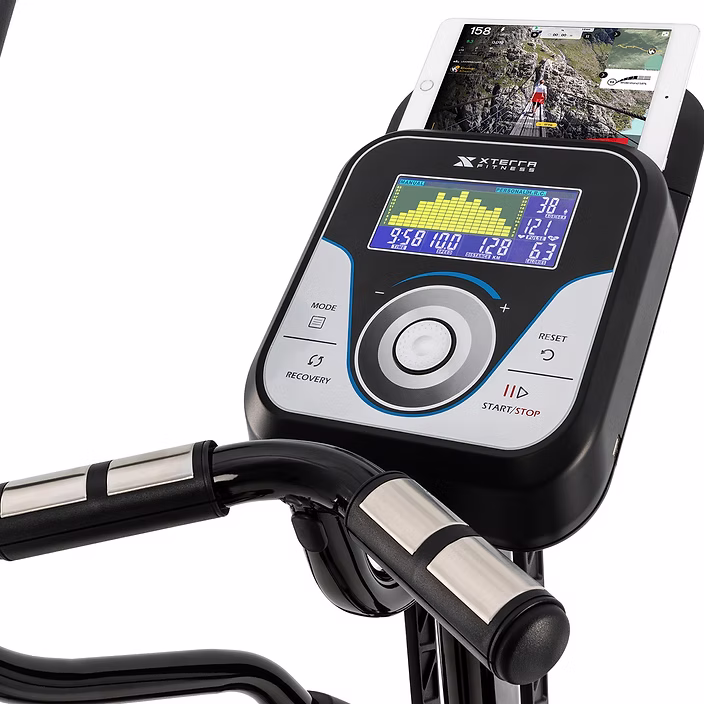 Den store fargeskjermen med bakgrunnsbelysning viser tid, distanse, hastighet, kalorier, puls, motstandsnivå, tråkkfrekvens og watt. Via Bluetooth kan du koble til nettbrett eller telefon for å trene virtuelt på realistiske videoruter med Kinomap, eller konkurrere mot andre i Zwift. Begge appene er betalingstjenester.